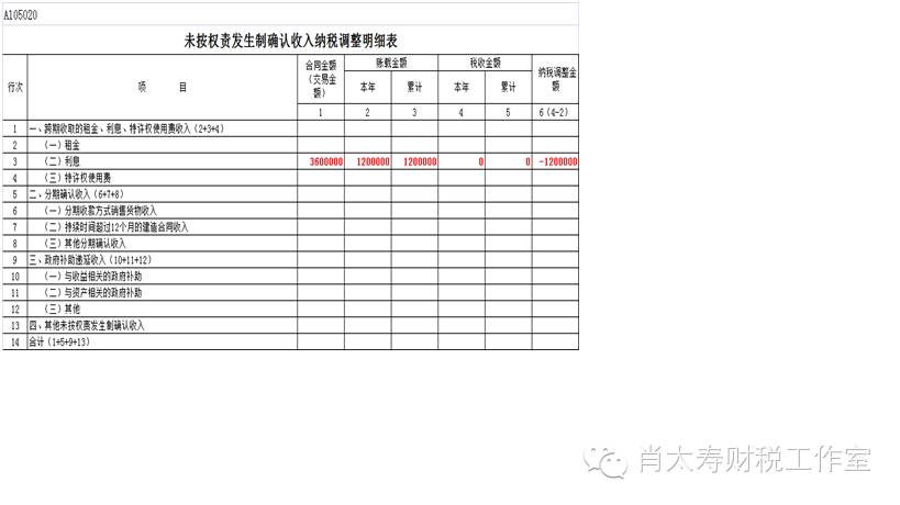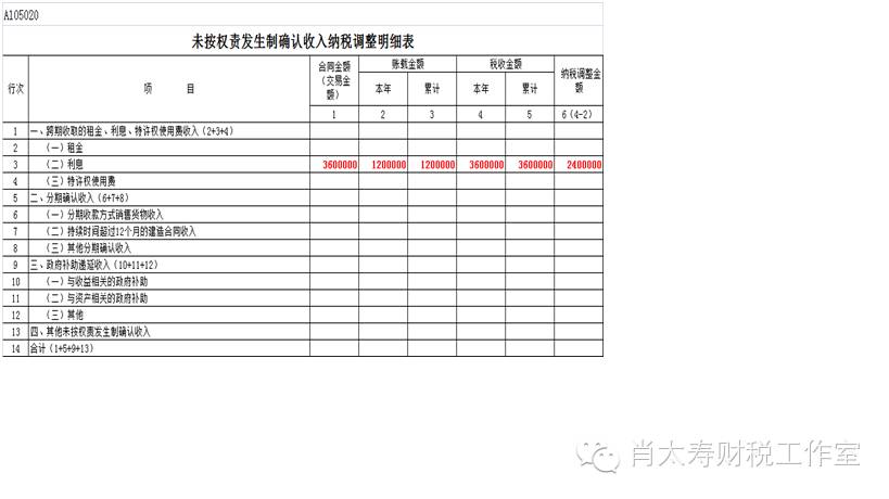 后,2016年对2015年度进行企业所得税汇算清缴时,填写A105020《未按权责发生制确认收入纳税调整明细表》,填写范例如下: